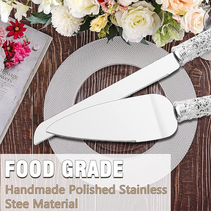 Wedding Silver Cake Knife and Server Set - 2 Pcs Dessert Set Metal Handle with Crystal Stones Decoration for Wedding, Anniversary Party Birthday Banquets,Gifts for Bride and Groom