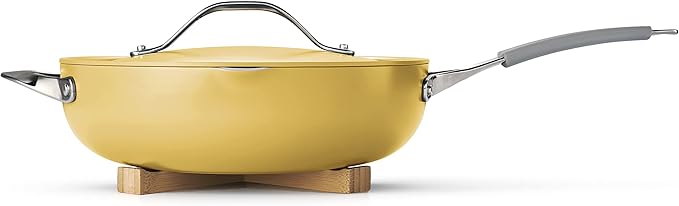 Tramontina All-in-One Plus Pan Set, 5-Quart Ceramic Non Stick Cooking Pan with Lid, Steamer Insert, Bamboo Utensil and Trivet, Yellow