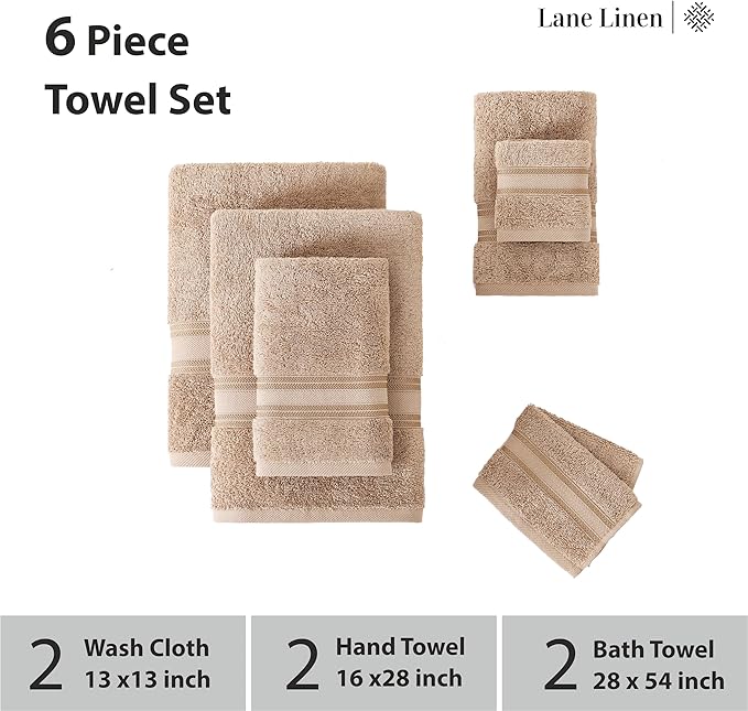 LANE LINEN Luxury Bath Towels Set - 6 Piece 100% CottonBathroom Zero Twist Shower Extra Absorbent Towel Super Soft 2 Hand Wash Cloths Taupe
