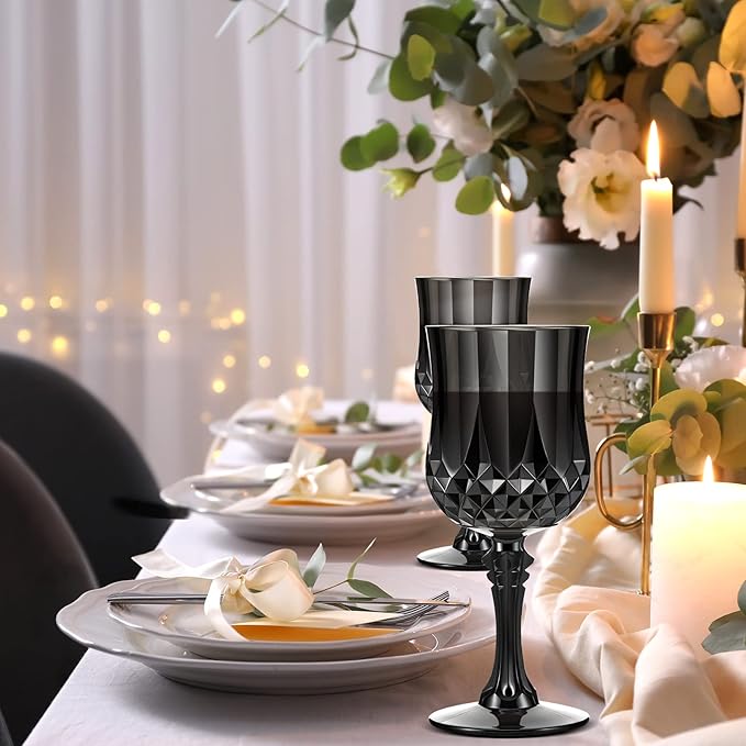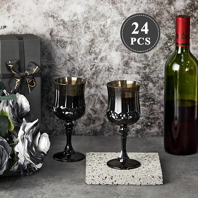 Pinkunn 24 Pcs 7 oz Plastic Vintage Wine Glasses Reusable Colored Goblets Patterned Drinking Water Glasses Cup Dishwasher Safe for Christmas Wedding Reception Party Supplies (Black)