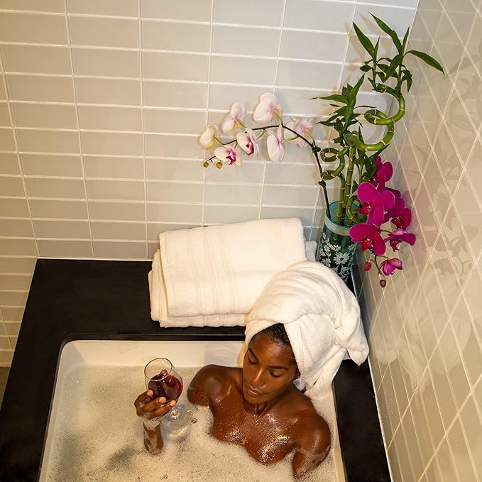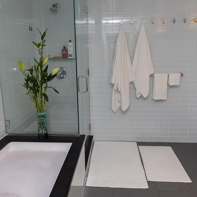 - Towels: 50% Viscose Made From Bamboo & 50% Aegean Turkish Combed Cotton, 700 GSM / Bath Mats: 55% Viscose Made From Bamboo & 45% Aegean Turkish Combed Cotton, 1000 GSM – Carefully crafted with optimal weight and thickness to soak up water and comfort your skin. Double twisted yarns are spun out of extra-long fibers to ensure superior quality and performance. Buy individually or in Family Multi-Packs.