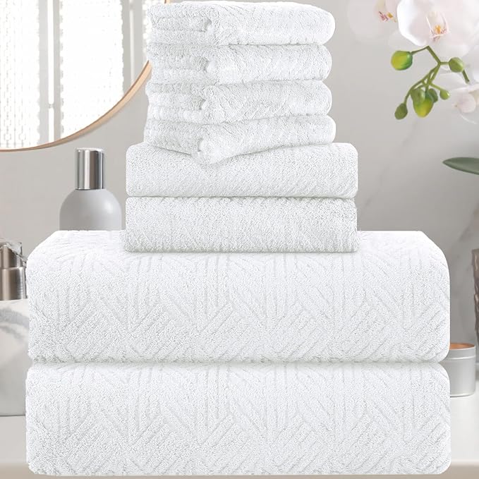 - ❤White Towels Bathroom Sets of 8: Extra large bath towels set of 2 (35"x70"), hand towels set of 2(16“x31”), washclothes set of 4(13"x13"),These large bath towels are fluffy and soft, wrapping yourself up in a cozy towel, comfortable lounging after a refreshing shower or relaxing soak.