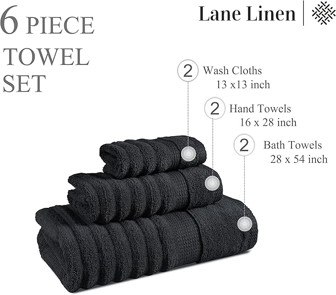 LANE LINEN 6-Piece Bath Towel Set – 100% Cotton, Quick Dry, Zero Twist, Ribbed, Luxury Towels, Includes 2 Large Bath Towels, 2 Hand Towels, 2 Washcloths, Premium Everyday Use - Black