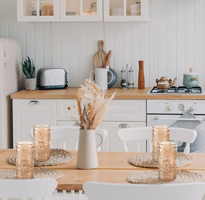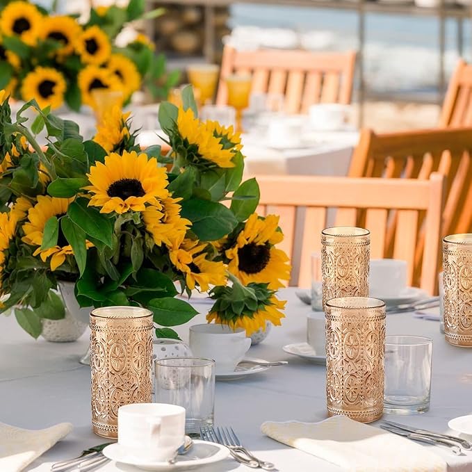 - What You Get: Set of 4 amber highball glasses, measures 2.8"diameter, 5.5"High and 12 oz capacity and the perfect size.The amber glassware set with vintage embossed like rystal with an old-fashioned flair! Sturdy and oh-so-lovely! They add such color first thing in the morning and sparkle in the sunlight.