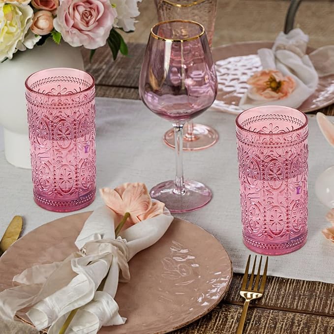 - 🥂[ Vintage Design ] -- The drinking glasses decorated with vintage embossed designs and crystal clear. Not only beautiful and durable, but also can increase the grip, the cup is not easy to fall. The pink color design is very romantic, and shining under the light, exuding a romantic and charming atmosphere, which is very attractive.