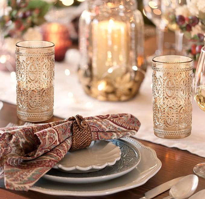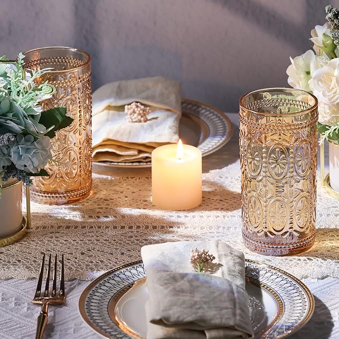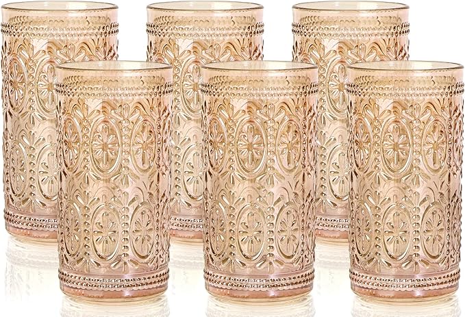 - 🥂[ Vintage Design ] -- The drinking glasses decorated with vintage embossed designs and crystal clear. Not only beautiful and durable, but also can increase the grip, the cup is not easy to fall. The amber color design is very mystery, and shining under the light, exuding a romantic and charming atmosphere, which is very attractive.