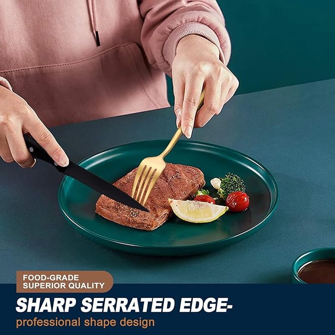 - 48-PIECE MATTE GOLD SILVERWARE SET: Including 8 dinner knives, 8 dinner forks, 8 dinner spoons, 8 dessert forks, 8 dessert spoons and 8 steak knives. This gold matte flatware set is essential for families or restaurants, perfect for the daily use and the reserve for special occasions.