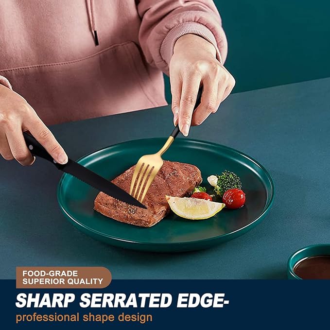- 48-PIECE MATTE BLACK&GOLD SILVERWARE SET: Including 8 dinner knives, 8 dinner forks, 8 dinner spoons, 8 dessert forks, 8 dessert spoons and 8 steak knives. This black&gold matte flatware set is essential for families or restaurants, perfect for the daily use and the reserve for special occasions.