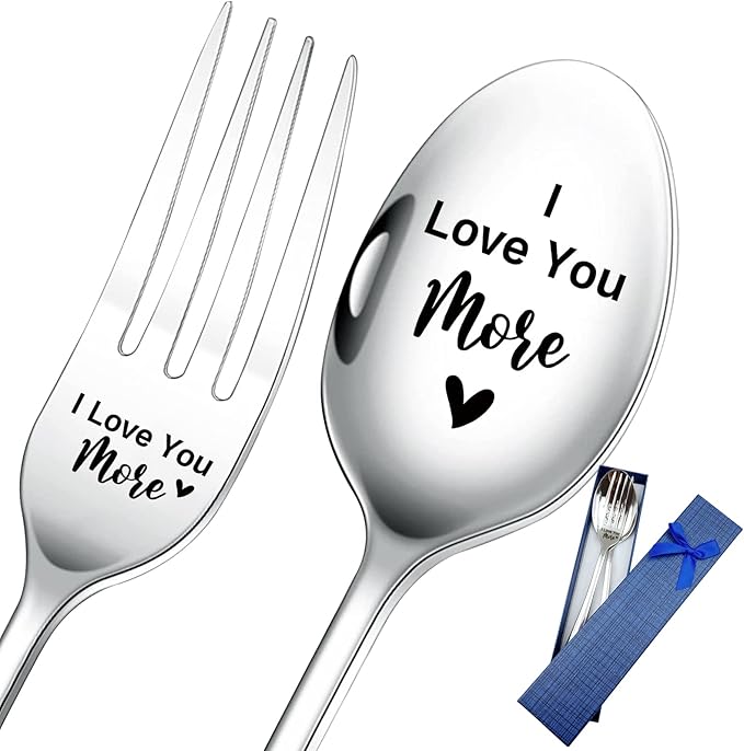 2 Pieces I Love You More Funny Engraved Stainless Spoon Fork Set,Restaurant Dinner Spoon Fork With Gift Box for Boyfriend,Girlfriend,Husband,Wife,Anniversary,Valentines Mothers Day Gifts