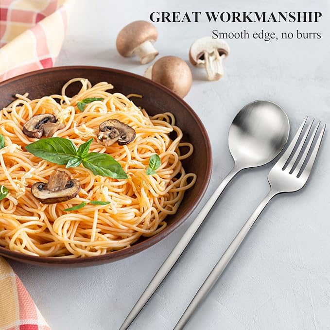 - Flatware set made of high quality stainless steel, the edges are smooth to prevent cutting your mouth. Matte polish finish will not easily leave traces. Rust resistant and durable, the color not to fading or peel off.