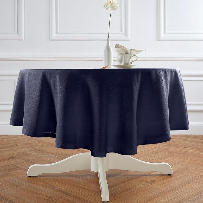 Solino Home Linen 60 Inch Round Tablecloth - 100% Pure Linen Indigo Navy Round Tablecloth - Machine Washable Table Cloth for Winter - Sonoma Hemstitch