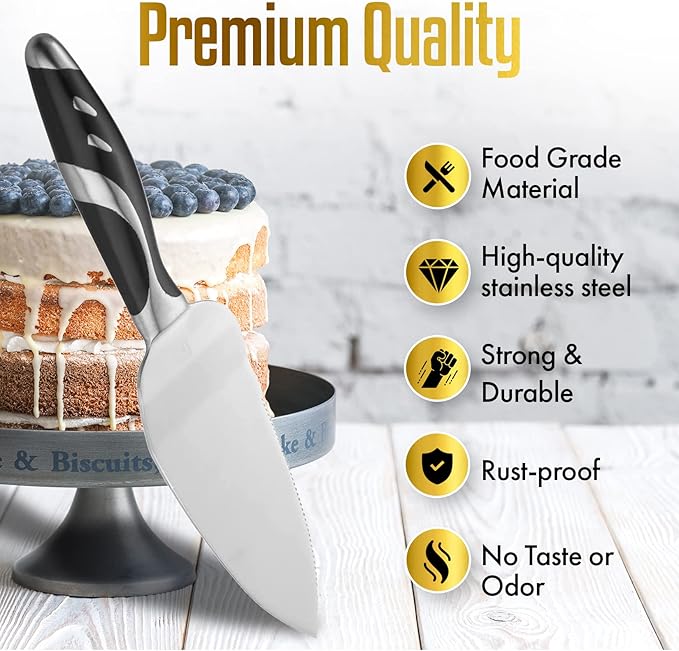 - SECURE NON-SLIP GRIP FOR PRECISION HANDLING: Our Cake Knife and Server Set is engineered with a secure non-slip grip, ensuring confident handling and precise control with every slice. Whether you're cutting through layers of decadent cake or delicately serving pastries, our set provides stability and comfort, allowing you to create beautiful presentations with ease.