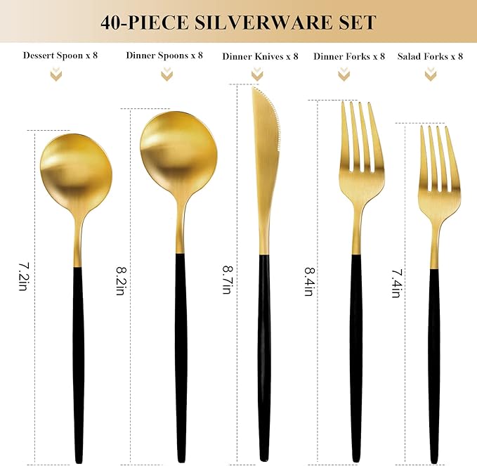 Gold Silverware Set for 8, MIKIWAY Matte Gold With Black Handle Flatware Set, 40 Pieces Stainless Steel Cutlery Tableware Set, Kitchen Utensils Set Include Spoons And Forks Set, Dishwasher Safe
