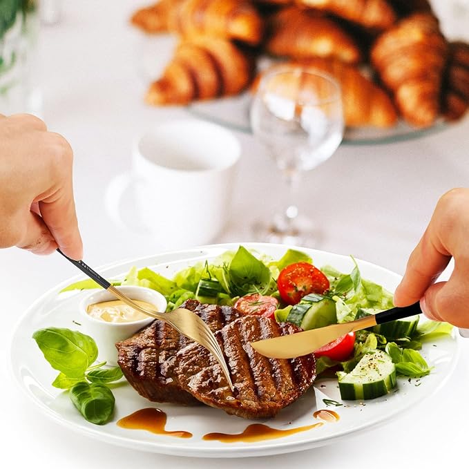 - Gold with black handle flatware made of high-quality stainless steel, not easy to rust and healthy. Perfect for much occasion, kitchen, restaurant, catering, gathering, banquet, hotel, entertaining, buffet, camping, party, wedding, birthday or other formal occasions.