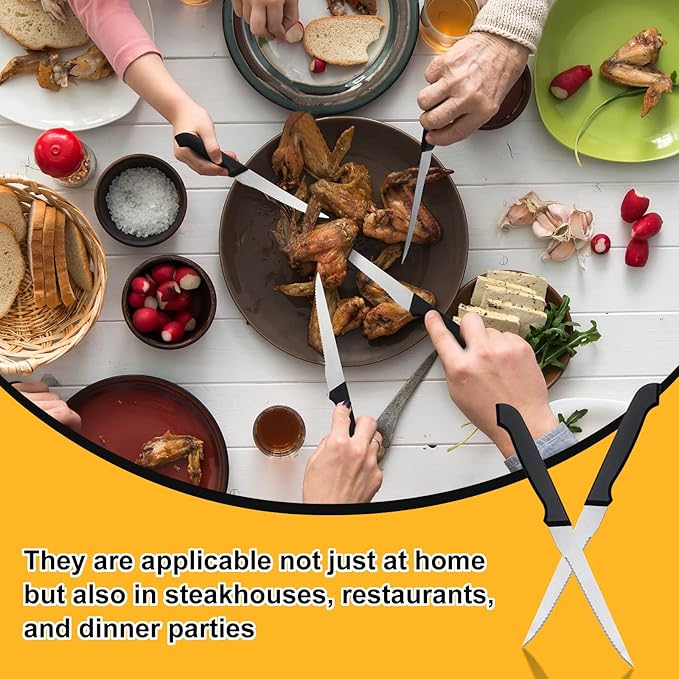 - Commercial Quality: the serrated steak knives are made of quality stainless steel, which will not easily rust, and the blade has serrated teeth, for you to cut through steak or meat with little effort, ease the labor you have to do in the kitchen; The knife helps you to have a faster cooking process