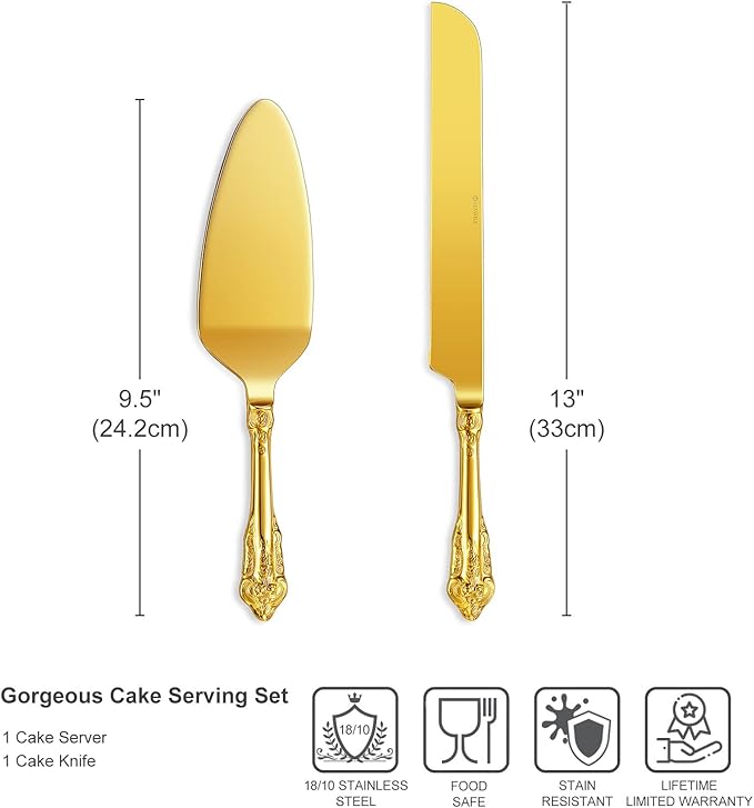 - Crafted of 18/10 stainless steel; knife blade is made of 13/P0 stainless steel with fine serrations. Elegant Sophisticated Handles: The handles of the knife and server are exquisitely designed, adding a touch of sophistication and glamour to your special event. The intricate detailing makes this set a stunning centerpiece for your cake table.