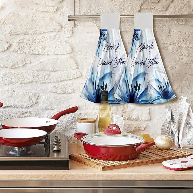 Giwawa Relax Soak Unwind Breathe Hand Hanging Towel Blue Flower Kitchen Tie Towels Set of 2 Dish Cloths Durable for Bathroom Laundry Room