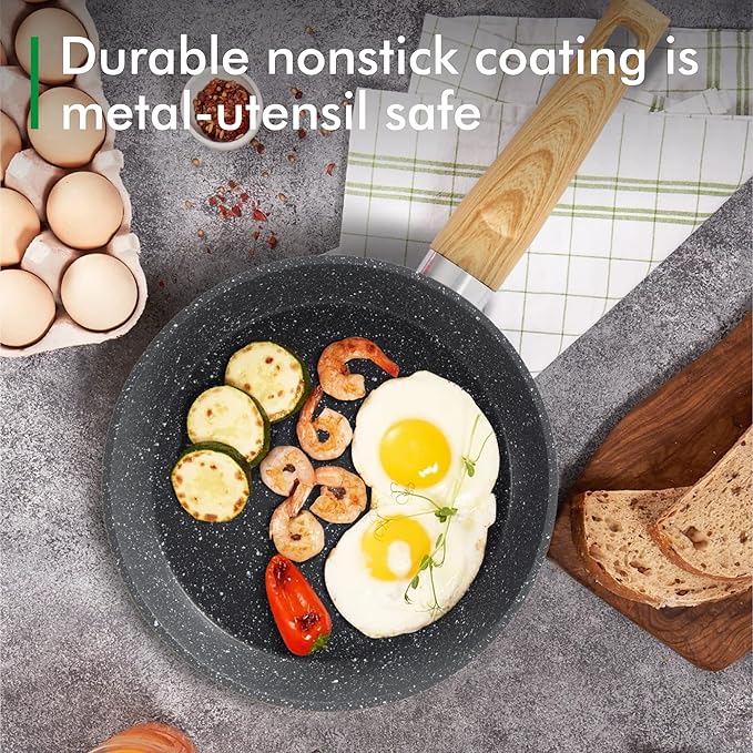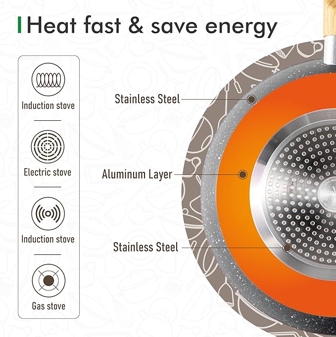 - Non-Stick Granite Coating: Our pan set interior & exterior is coated by high performance non-stick granite coating, which makes the skillet easy to cook and clean. It means less oil or butter using for healthy and better diet cooking