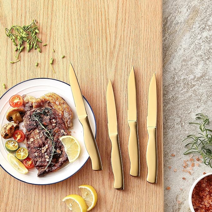 - NON-STICK & RUST-RESISTANT – The golden titanium coating prevents the steel from oxidizing, so kitchen knife set will stay non-stick and rust-resistant for years to come. Easy to clean: hand wash for best result.