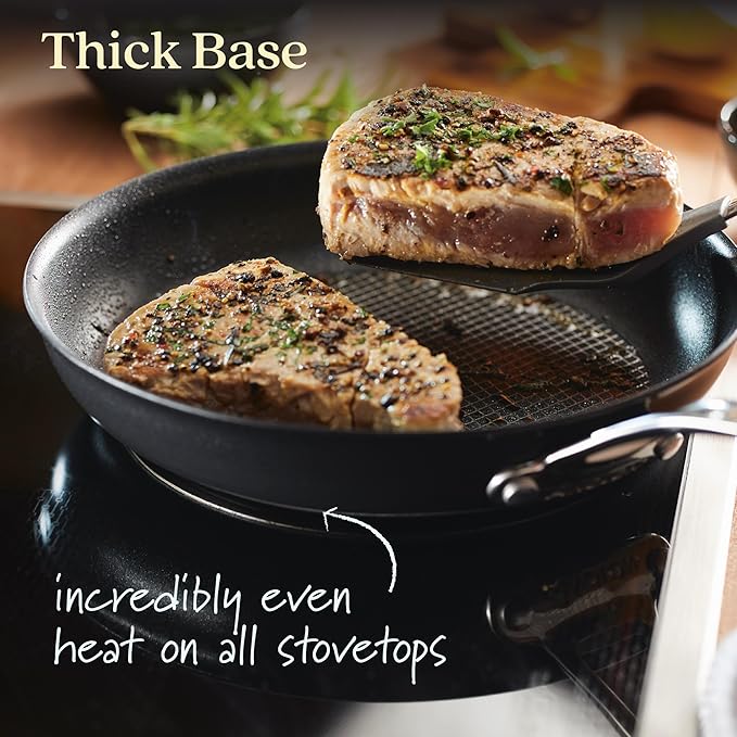 - INNOVATIVE BASE: Hybrid nonstick frying pans feature a thick, uniquely constructed stainless steel base that delivers incredibly even heat on any cooktop, including induction