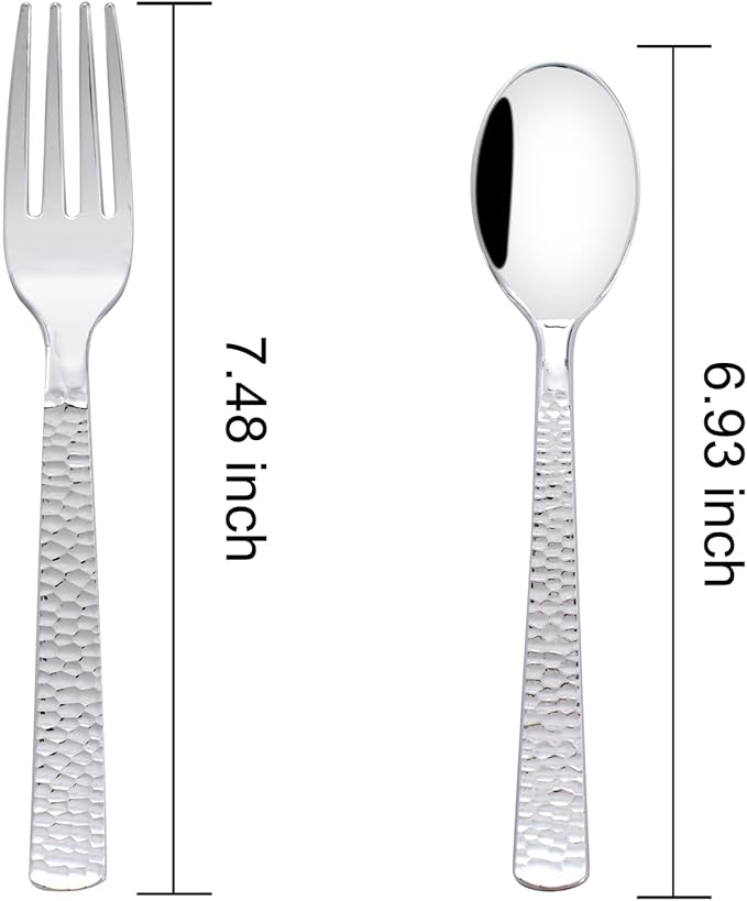 - PREMIUM QUALITY: These silver plastic spoons and forks are made of heavy-duty plastic to provide a pleasant dining experience for you and your guests. The silver spoons and forks set is are smooth surface, not easy to crack