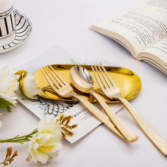 - ELEGANT DESIGN: 400 pieces of gold plastic forks and spoons are shiny, simple yet stylish, brings a touch of grace to your posh party set up! Gold hammered forks and spoons have a unique design and classic look that is much more attractive.