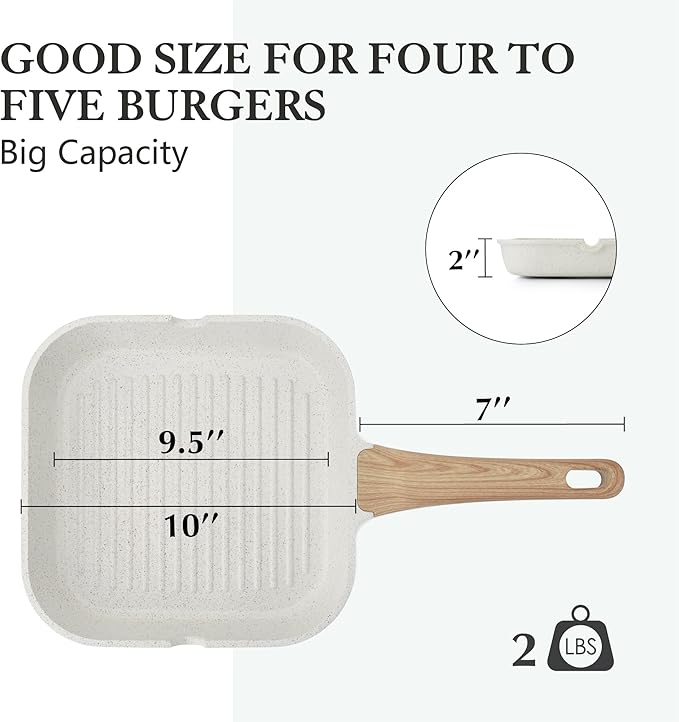 - Sturdy & Durable - This grilling pan is made of die-cast aluminum, heavy-duty, sturdy, durable and won't warp in 10 years. The Bakelite handle is comfortable to grip and stays cool to the touch.