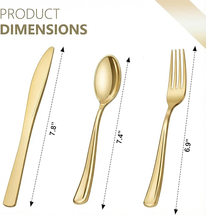 - Included Components : 100pcs Gold Knives, 100pcs Gold Spoons, 200pcs Gold Forks