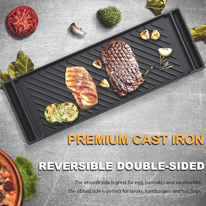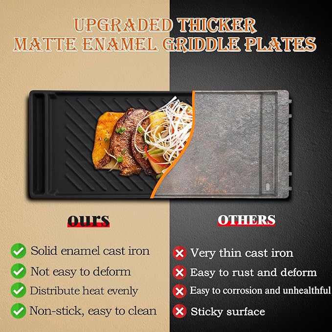 - 【HEAT RETENTION】The samsung flat top griddle made of enamel cast iron have significant heat retention capacity. Our good quality samsung griddle ensure your cookware get adequate exposure to heat besides.【FOOD FLAVOR】Before using for the first time, the samsung middle burner griddle should be seasoned so that the surface does not stick. A seasoned griddle helps to enhance the flavor of your food. Food cooked on a cast iron griddle, it will get a crispy, golden brown layer and a pan-seared taste.