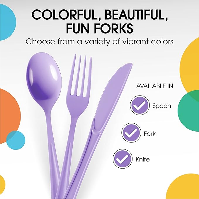 - 【 Includes 】 200 pack of heavy-duty 7.5 inch Lavender plastic Forks. These durable Forks are strong yet disposable cutlery making them the perfect plastic silverware option for any party or occasion. Offering multiple different color options, they are sure to match your decor.