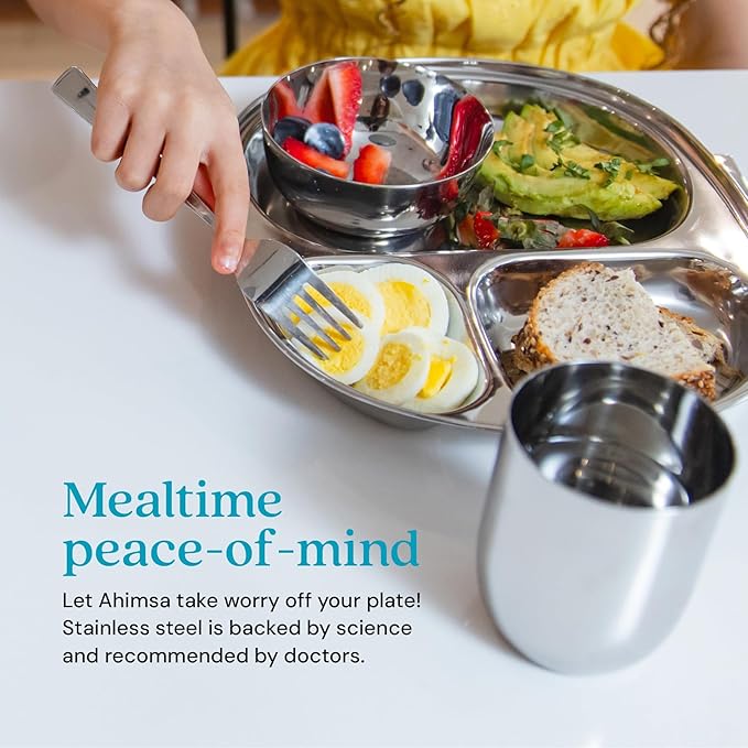 - MEALTIME PEACE OF MIND: Created by a pediatrician and mom, Ahimsa stainless steel kids plates are crafted from premium 304 (18/8) food-grade steel, the only kid-friendly material recommended by the American Academy of Pediatrics. Our stainless steel plates for kids are free from harmful chemicals, mindfully made, endlessly reusable, and designed to bring joy to every bite.