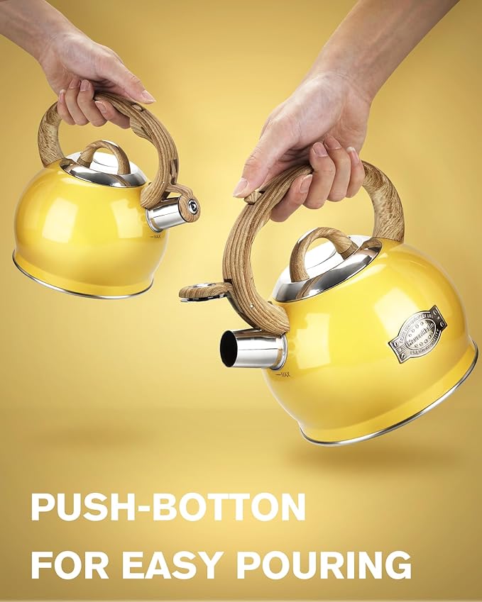 - Large Capacity &Safe to Use : The yellow stovetop teapot has a capacity of 2.1 Quart, and is suitable for families or parties of 4-5 people. Professional food-grade finish and stainless steel workmanship ensure this jug is rust and corrosion resistant, so you can use it with confidence
