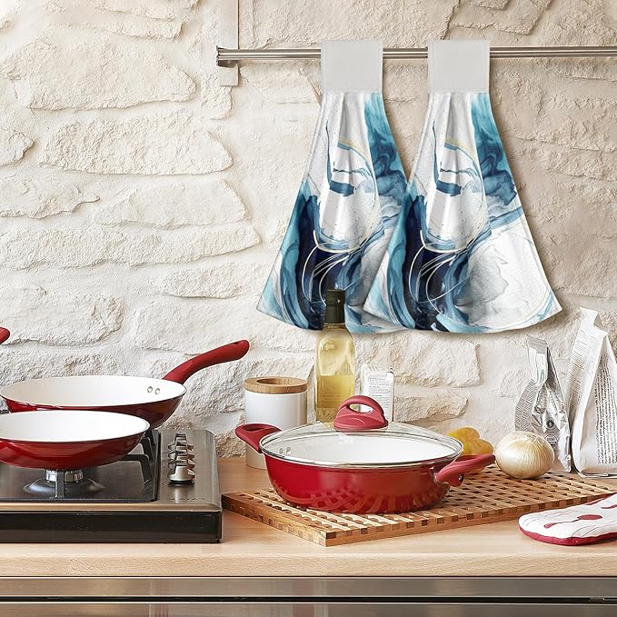 Giwawa Blue Abstract Kitchen Hand Towels 2 Pieces Canvas Art Dish Cloth Tie Towels with Hanging Loop Tea Bar Towels for Bathroom Tabletop Home