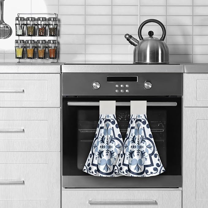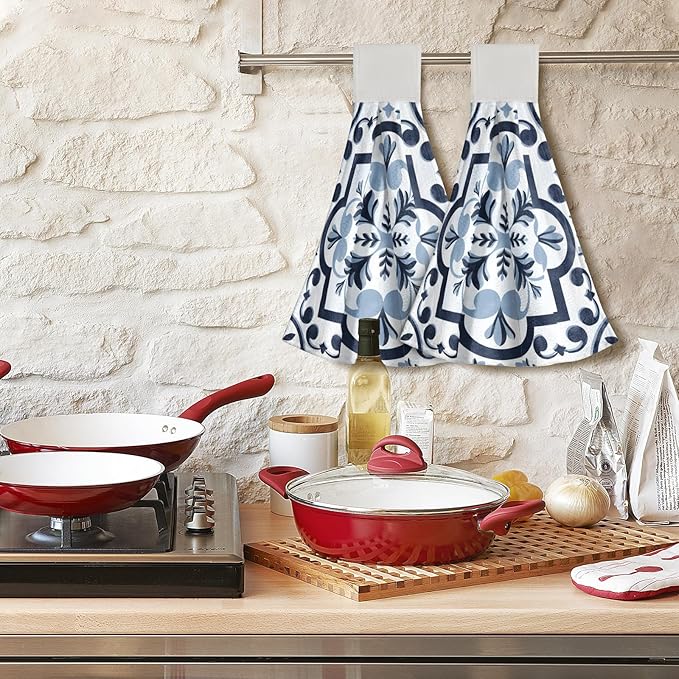 Giwawa Navy Flower Kitchen Hand Towels Modern Boho Hanging Tie Towels Fast Drying Dish Cloth with Loop 2 PCS for Bathroom Restroom Home Decor