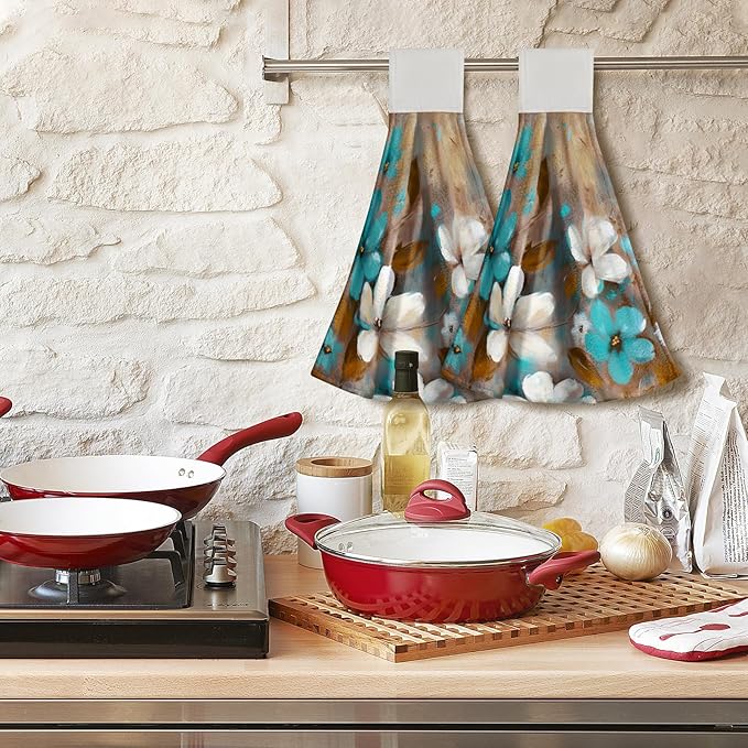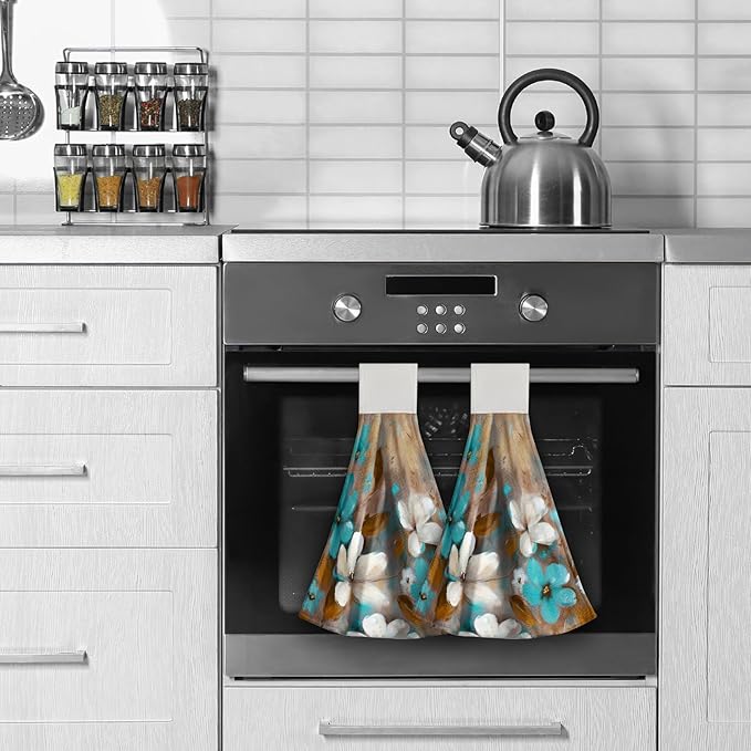 Giwawa Teal Floral Kitchen Hand Towels Abstract Canvas Hanging Tie Towel 2PCS Soft Dish Cloth Fingertip Towel for Bathroom Restroom Home Decor