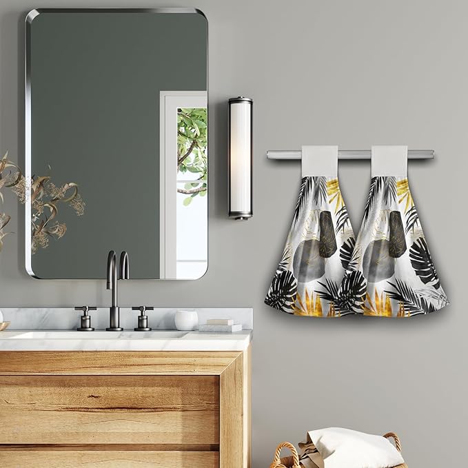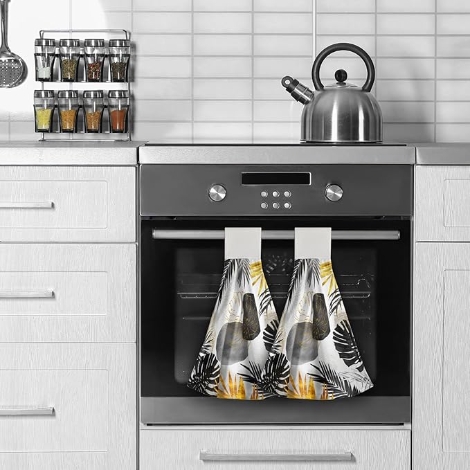 Giwawa Black and Gold Leaves Hanging Kitchen Towels 2 Pcs Tropical Palm Leaf Hand Towels Soft Tea Bar Dish Cloths Dry Towel for Bathroom Laundry
