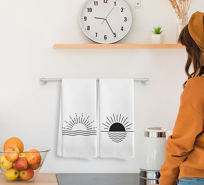 Minimalist Boho Black Sun Sunrise Sunray Sunburst Ocean Wave Sea Horizon Kitchen Towels and Dishcloths Sets of 2,Boho Absorbent Drying Cloth Hand Towels Tea Towels for Bathroom Kitchen,16×24 inches