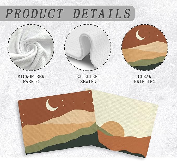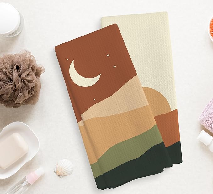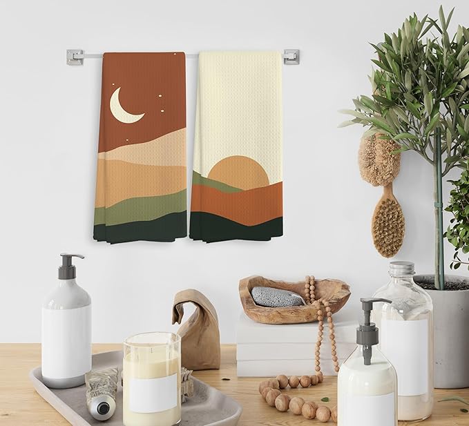 Abstract Boho Sun Moon Mountain Sunrise and Starry Night Landscape Kitchen Towels and Dishcloths Sets of 2,Boho Absorbent Drying Cloth Hand Towels Tea Towels for Bathroom Kitchen,16×24 inches