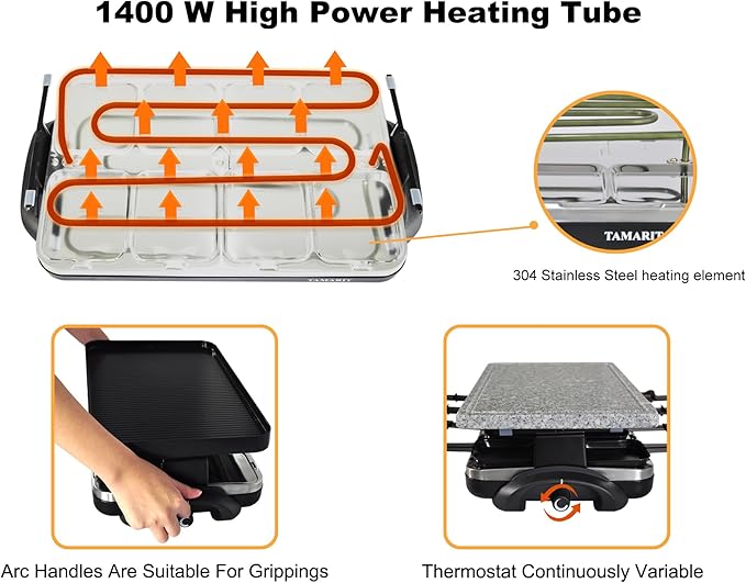 - 3 in 1 Grills: Raclette cheese grill, with a die-cast aluminum grill plate and a marble grill plate. The al grilling plate with two reversible surfaces, one grooved surface can be grilled with grilling marks and remove excess oil, the other flat surface is for grilling fried eggs, crepes, pancakes. The raclette grill stone plate needs to warm up for about 20 minutes and with good warm-keeping function. 3 in 1 electric grills save the trouble and time to pull out another equipment