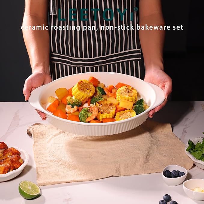 LEETOYI Porcelain 9x13 Large Oval Au Gratin Pans,Baking Dish for Servings, Bakeware with Double Handle for Kitchen and Home, White