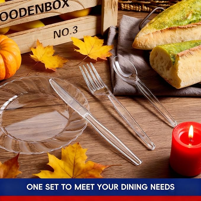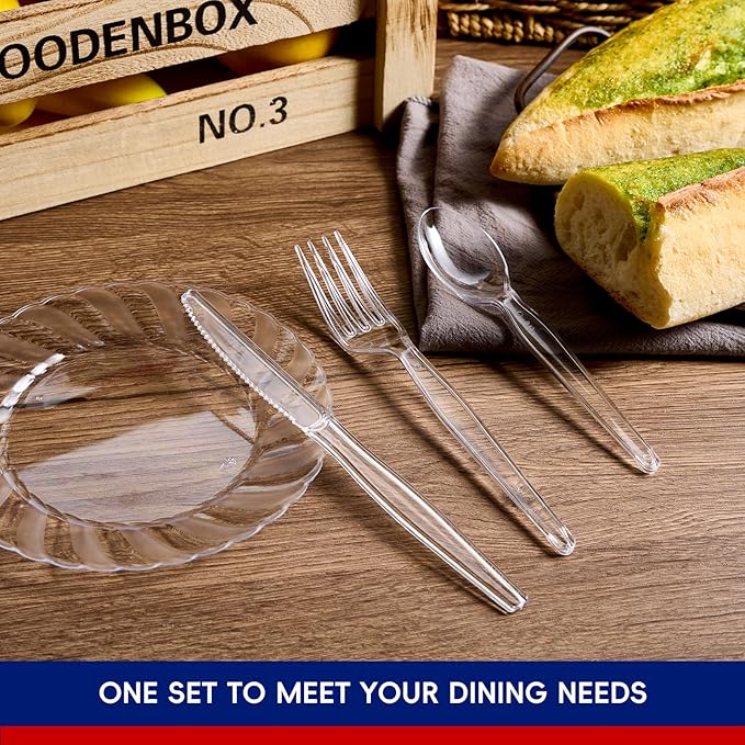 - Classic Design: The disposable plastic clear set showcases a classic design with a comfortable touch, and its well-designed curved shape won't bend or break when in use, allowing you to enjoy even heavy or dense food with maximum comfort.