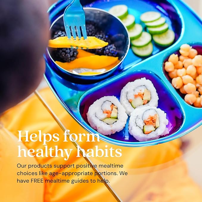 - BONDED COLOR THAT LASTS: Each rainbow stainless steel toddler plate features a safe titanium PVD finish — never paint or harmful coatings — for brilliant, fade-resistant color. The hue is bonded directly to the steel, creating durable, easy-to-clean stainless steel kid plates that stay vibrant for years, even after countless wash cycles. All Ahimsa kids dishes are MADE SAFE certified to contain no BPA, PVC, phthalates, melamine, and are lead-free.