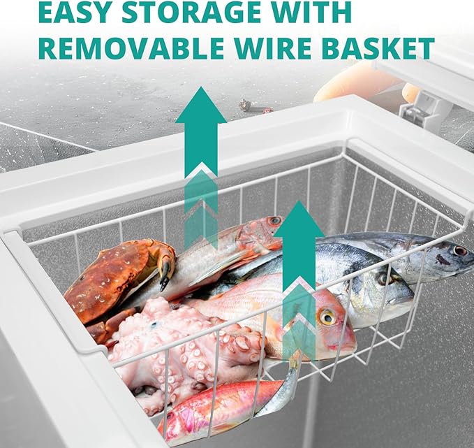- Top Hinge Door & Removable Storage Basket: The auto-hold door hinges between 45° and 90° angles allow you to easily access the chest freezer hands-free. 3 upper removable storage basket is convenient for storing small items and food to be taken out soon and sliding easily, you can quickly see the items below