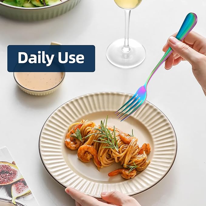 - 【Are you still worried about the rust of the dinner forks?】: ITITT forks are made of top food grade 18/0 stainless steel with mirror finish, providing you with a durable fork set that will last you many years. Their edges have been polished many times and are smooth that they won't scratch your mouth. Rainbow silverware set are resistant to rust, corrosion and dishwasher safe. It’s a great alternative to the plastic forks.
