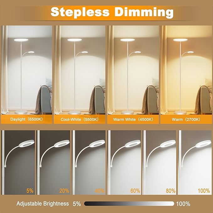 - STEPLESS DIMMING & MEMORIZE SETTING: Other dimmable floor lamps only have 3 color temperature, and no stepless dimming mode, while both of our bright lights have 4 color temperature 2700K--6500K. Short press to adjust 10-level brightness 5%-100%, Long press for stepless dimming setting. Smart memory function can remember your last brightness and color temperature when you turn on again. Very convenient!