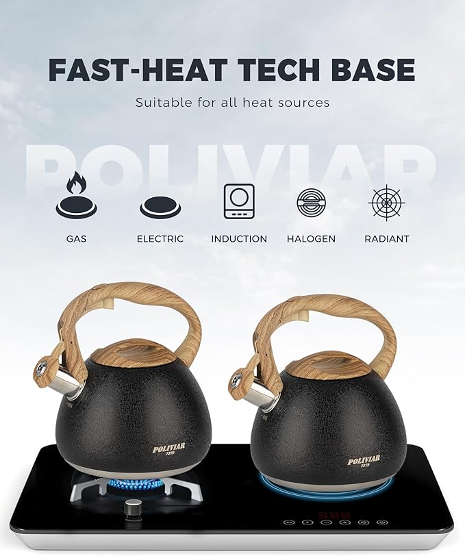 - Fast Heat Base: The tea kettle designed with a generous 8 in base can maximize the heat conduction to increase the efficiency of boiling. High grade stainless steel is suitable for any heat source including gas, electric and induction.