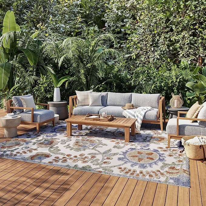 - BOLD STYLE: The oversized blooms of this floral outdoor rug are enhanced with a high-low pile that adds an attention-grabbing pop of pattern to your decor.