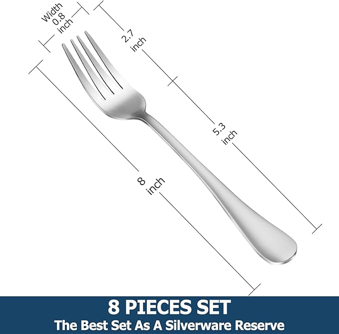 - GOOD VALUE: Our stainless steel fork set contains 8 dinner forks, which allow you to replenish the cutlery in time, and help you complete the tableware set when you find that the set is missing forks. If you’re looking for an inexpensive replacement without replacing entire silverware set, then you have come to the right place.