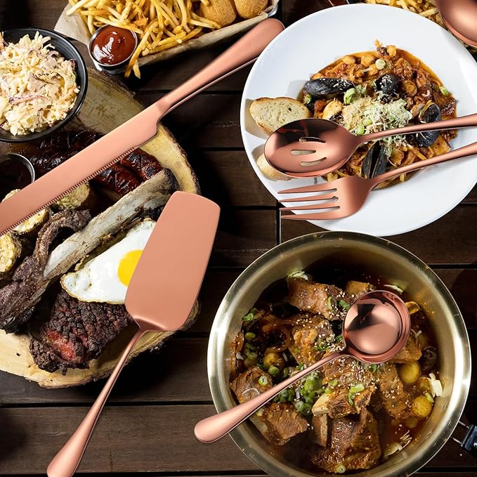 - ROSE GOLD/COPPER FLATWARE: Introducing our elegant and durable stainless steel serving silverware utensils set, featuring a stunning rose gold/copper flatware design that adds a touch of sophistication to any dining experience. the easy-to-clean design and dishwasher-safe feature make clean-up a breeze. Elevate your dining table and upgrade your serving tools with our stylish and functional Stainless Steel Serving Utensils Set