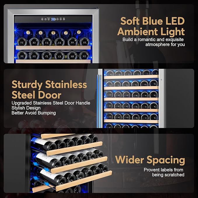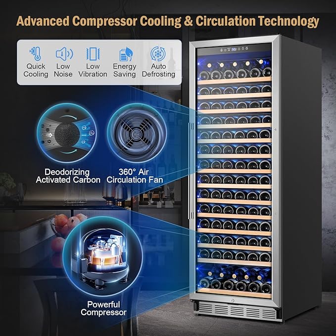 - POWERFUL COOLING SYSTEM: The wine cooler refrigerator is equipped with an advanced compressor that is energy efficient and ultra quiet to cool wine quickly, and two fans that distributes cool air evenly to every corner of the cooler